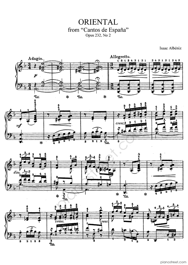 Isaac Albéniz: Oriental Op. 232 No. 2 in D Minor from Cantos de España - piano sheet music to print instantly. This piece is level 7 and was composed during the Late Romantic period.