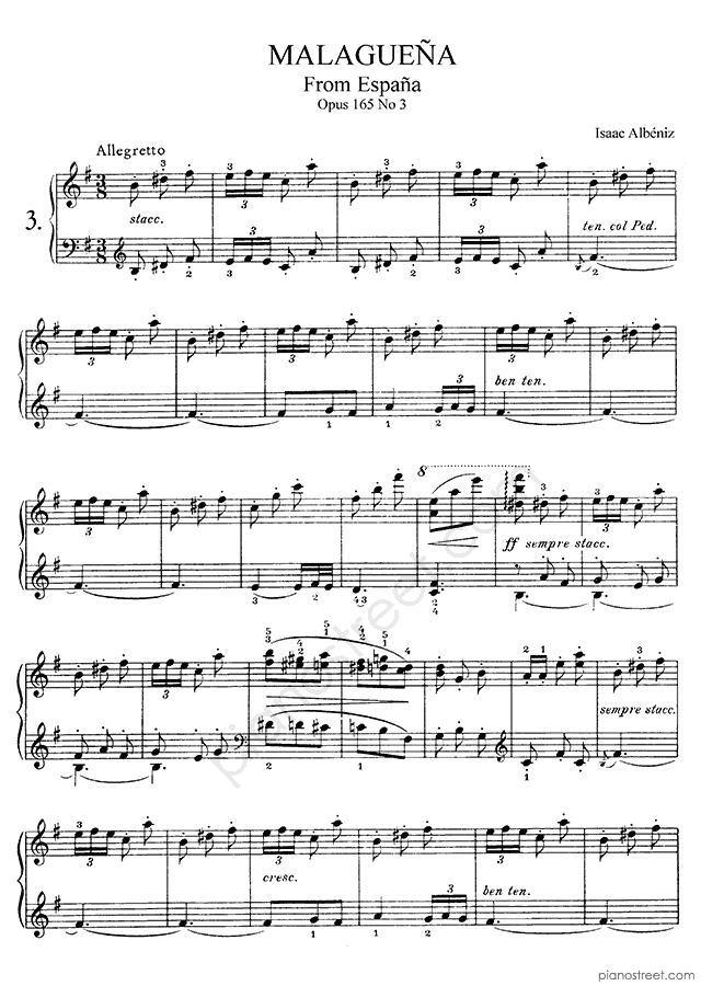Malagueña Op. 165 No. 3 by Isaac Albéniz. Sheet music and recordings of thousands of piano pieces by Isaac Albéniz and many other famous composers to view in your digital device, print out or listen to.