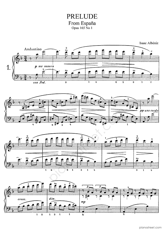 Isaac Albéniz: Preludio Op. 165 No. 1 from España - piano sheet music to print instantly. This piece is level 8+ and was composed during the Late Romantic period.