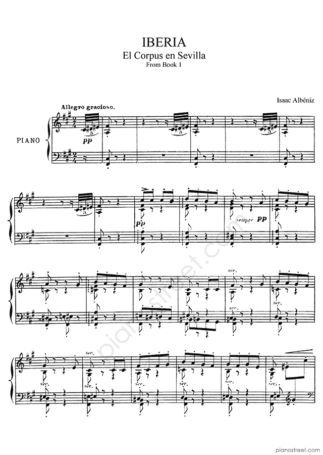 Isaac Albéniz: El Corpus en Sevilla No. 3 in F-sharp Minor from Iberia - piano sheet music to print instantly. This piece is level 8+ and was composed during the Late Romantic period.