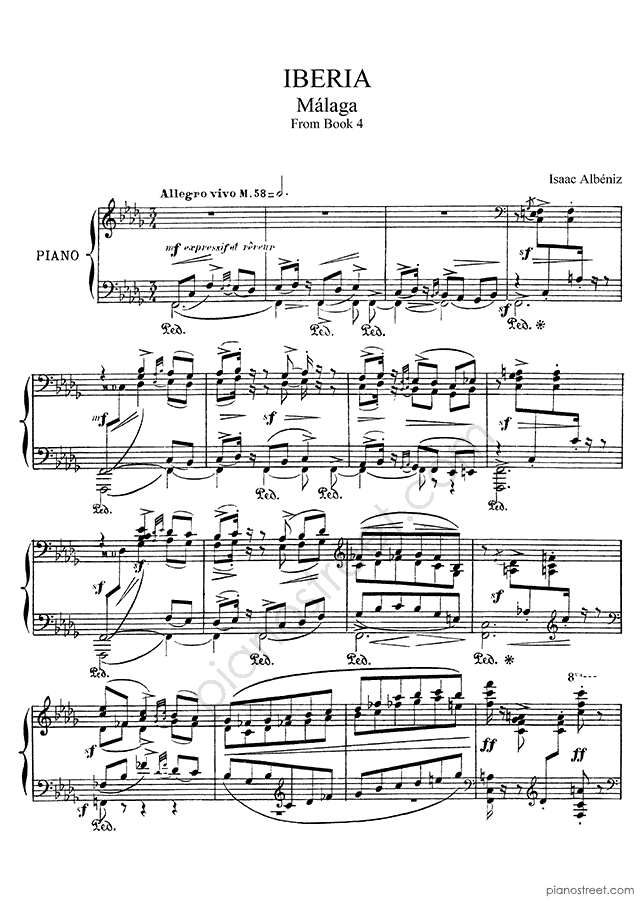 Málaga No. 10, a composition by the late romantic composer Isaac Albéniz who was born in 1860 and died in 1909. The piano score of this piece was first published in 1908 and is part of Albéniz's Iberia.
