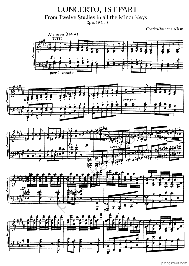 Charles-Valentin Alkan: Concerto 1st part Op. 39 No. 8 in G-sharp Minor from Twelve Studies in all the Minor Keys - piano sheet music to print instantly. This piece is level 8+ and was composed during the Late Romantic period.