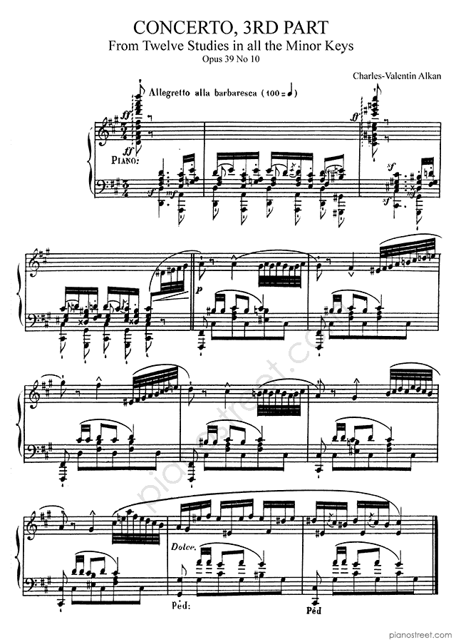 Concerto 3rd part in F-sharp Minor Op. 39 No. 10 by Charles-Valentin Alkan. Sheet music and recordings of thousands of piano pieces by Charles-Valentin Alkan and many other famous composers to view in your digital device, print out or listen to.