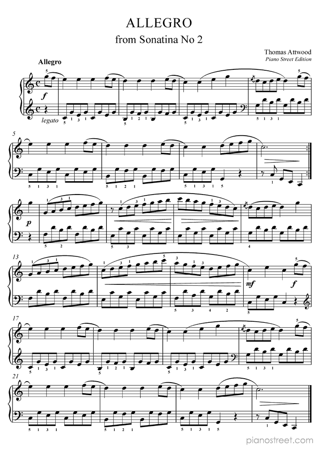 Piano sheet music downloads and recordings. This piece is by Thomas Attwood: Allegro (from Sonatina No. 2) in C Major (published in 1795) . Level 2, Period: Classical
