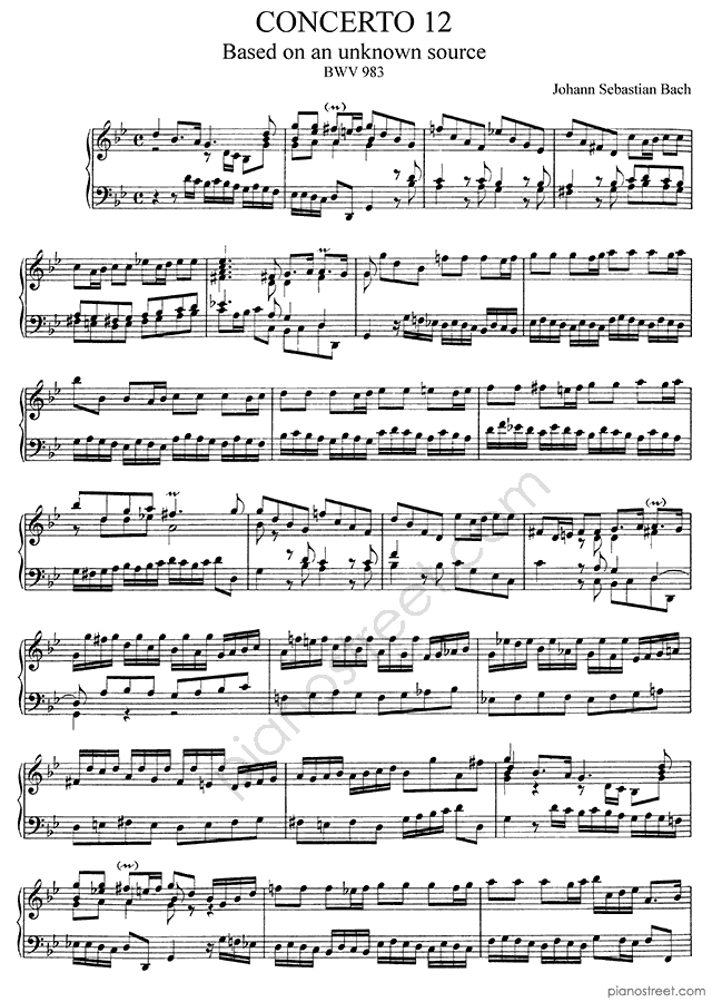 Piano sheet music downloads and recordings. This piece is from Concerto Transcriptions by Johann Sebastian Bach: Concerto 12 BWV 983 in G Minor . Level 8+, Period: Baroque
