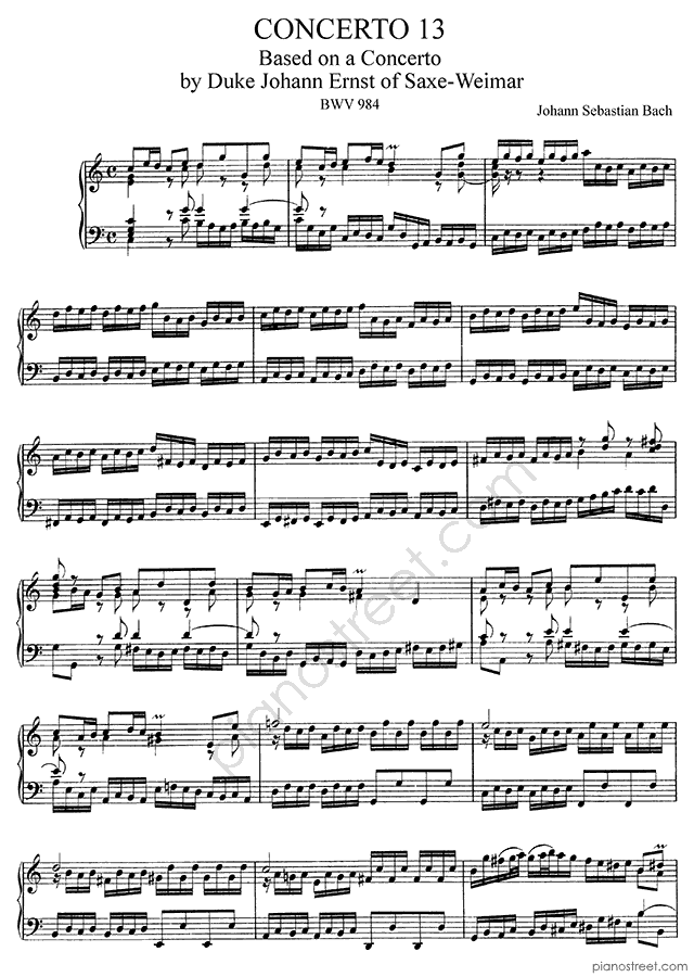 Johann Sebastian Bach: Concerto 13 BWV 984 in C Major from Concerto Transcriptions - piano sheet music to print instantly. This piece is level 8 and was composed during the Baroque period.