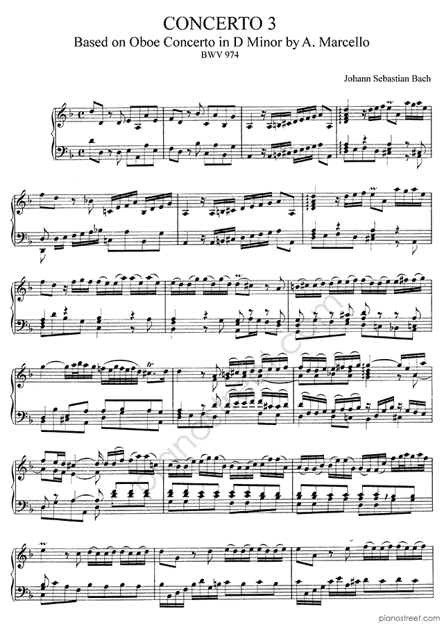 Johann Sebastian Bach: Concerto 3 BWV 974 in D Minor from Concerto Transcriptions - piano sheet music to print instantly. This piece is level 7 and was composed during the Baroque period.