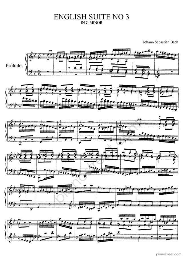 DOWNLOAD English Suite in G Minor No. 3 by Johann Sebastian Bach (published in 1722) . High quality classical piano scores from the Piano Street sheet music library.