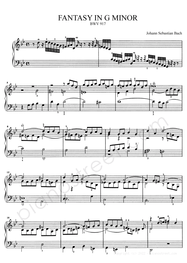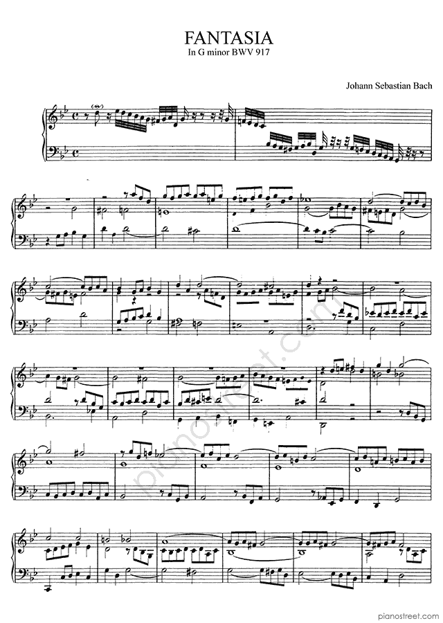 Fantasia in G Minor - BWV 917 is a piano piece by the baroque composer Johann Sebastian Bach who lived between the years 1685 and 1750.