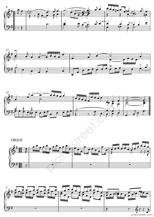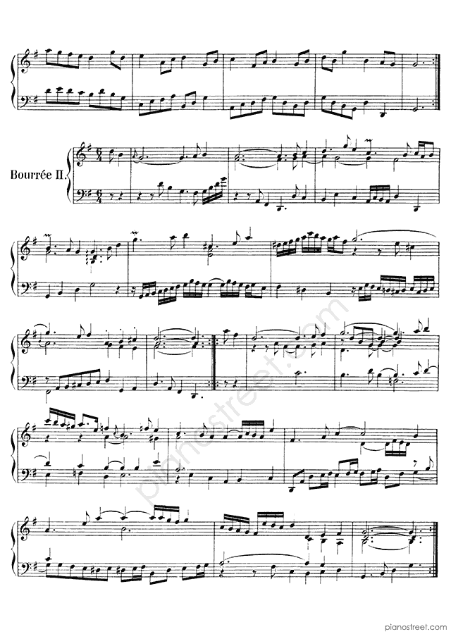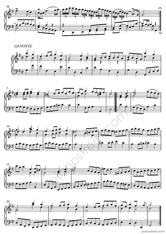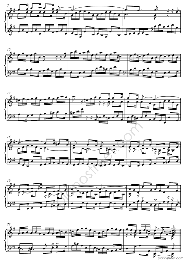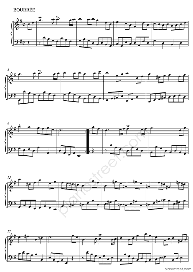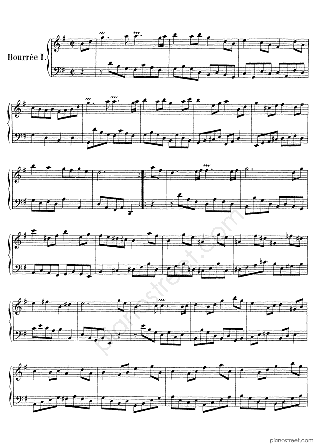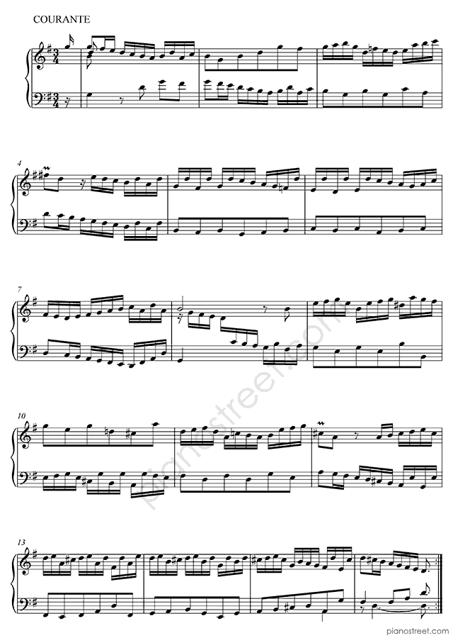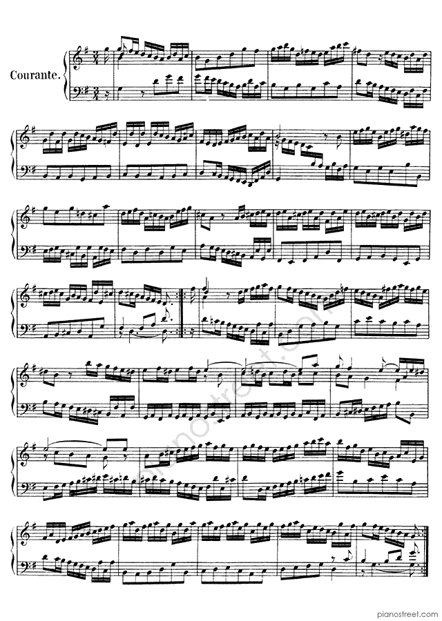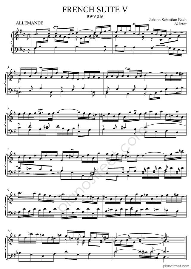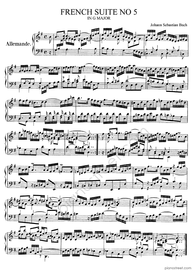 Johann Sebastian Bach, who was one of the prominent composers active in the Baroque era, wrote this piece titled "French Suite" No. 5 in G Major from French Suites. The composition is categorized as "Polyphonic, Suite" in the sheet music library and the level of difficulty in the piano music database is 8.
