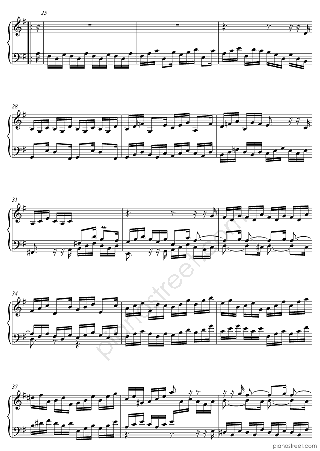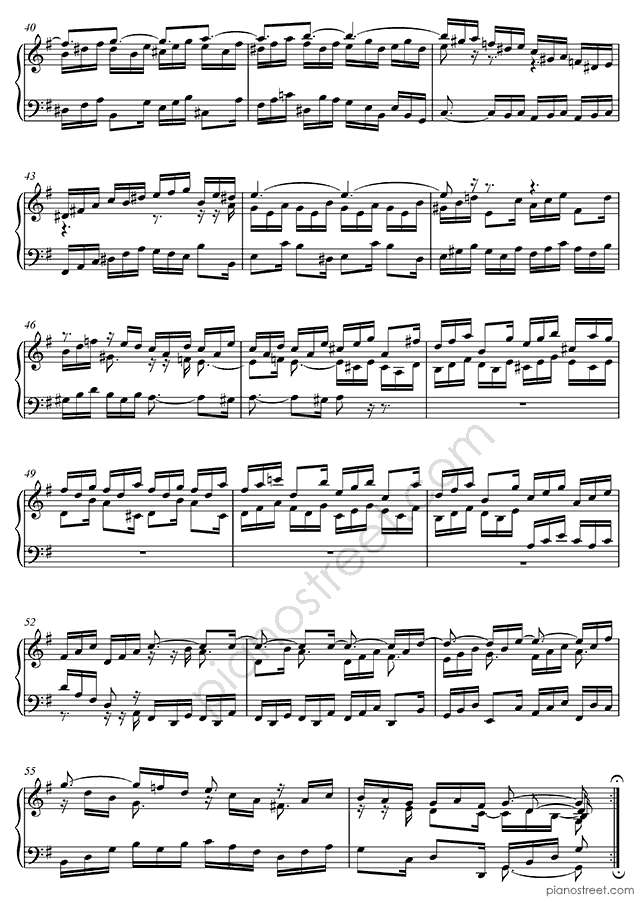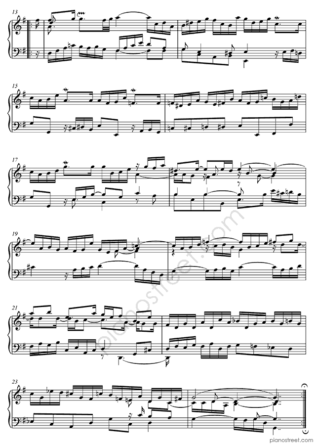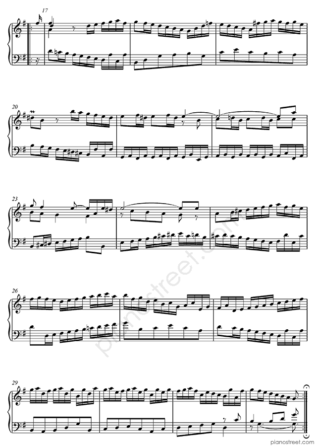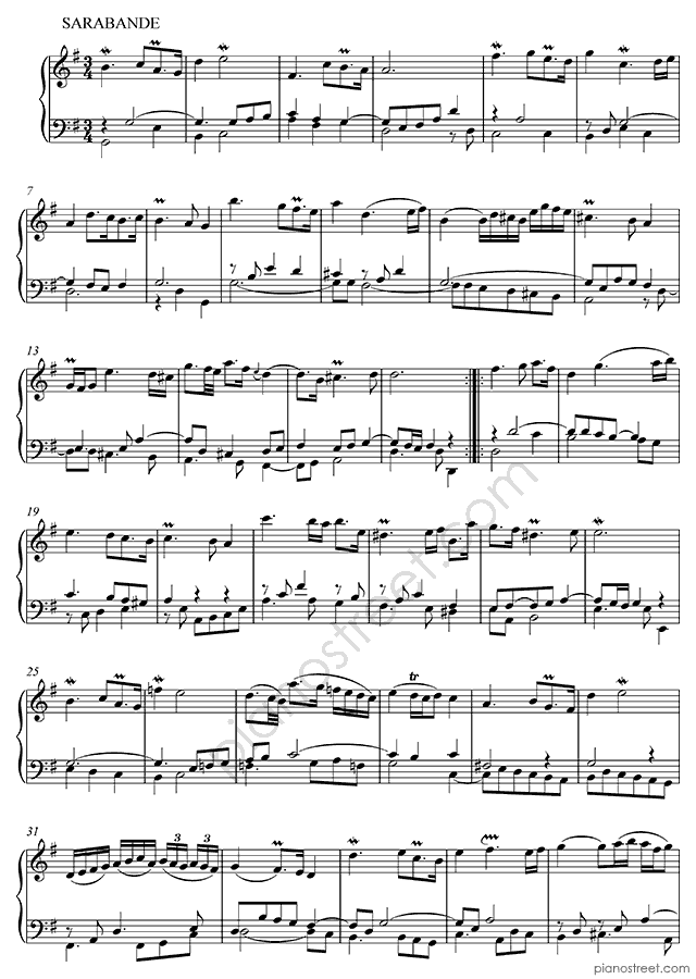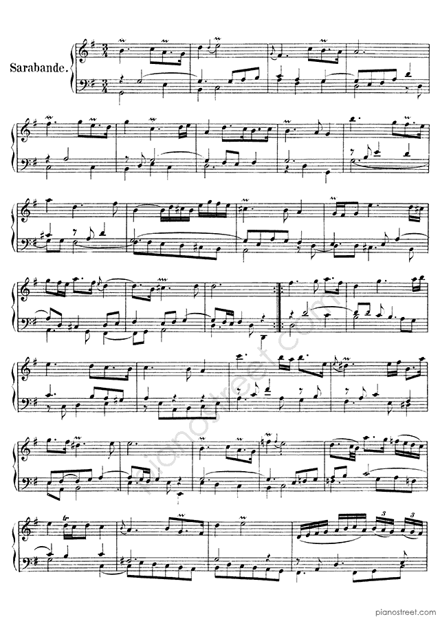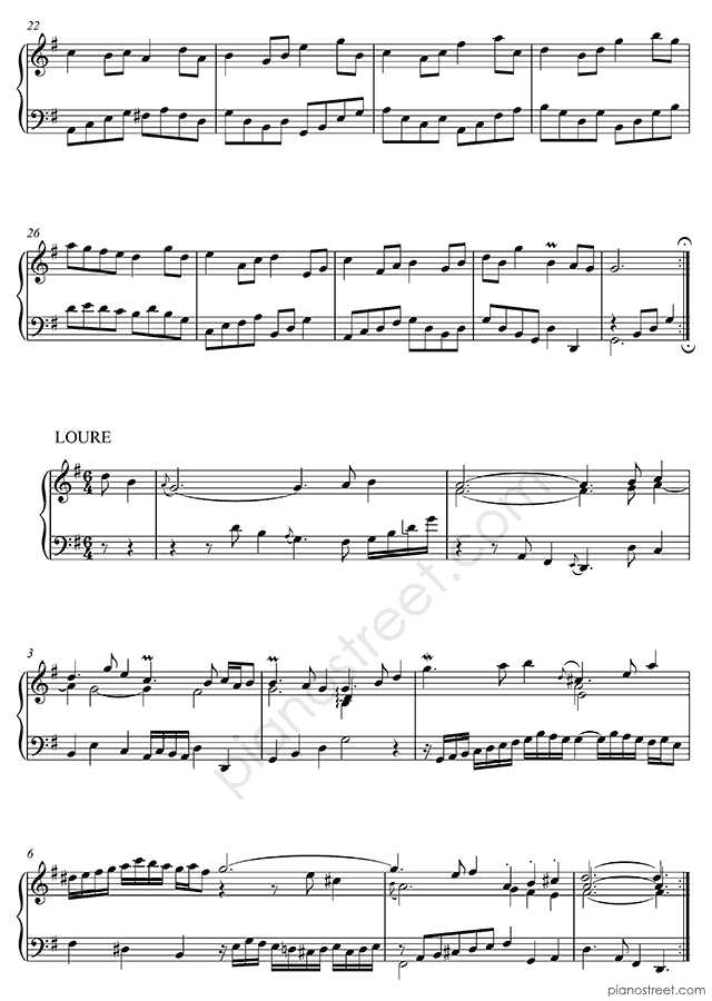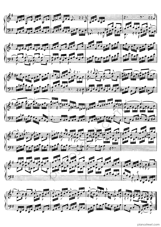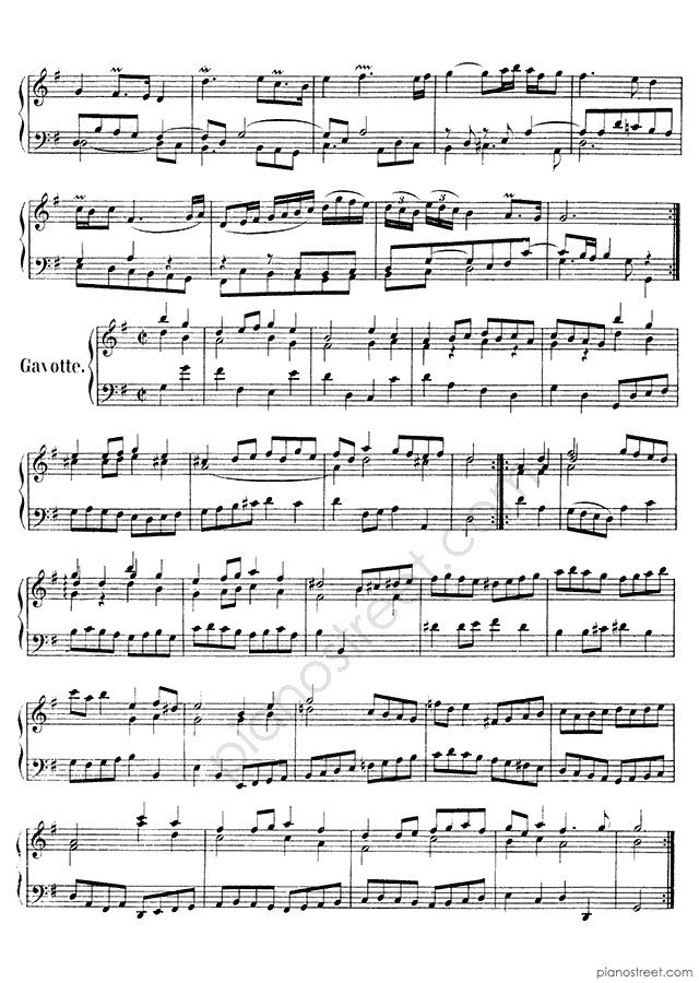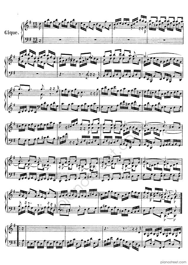 Johann Sebastian Bach, who was one of the prominent composers active in the Baroque era, wrote this piece titled "French Suite" No. 5 in G Major from French Suites. The composition is categorized as "Polyphonic, Suite" in the sheet music library and the level of difficulty in the piano music database is 8.