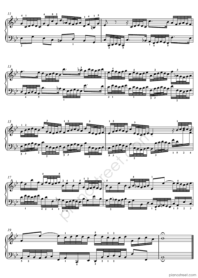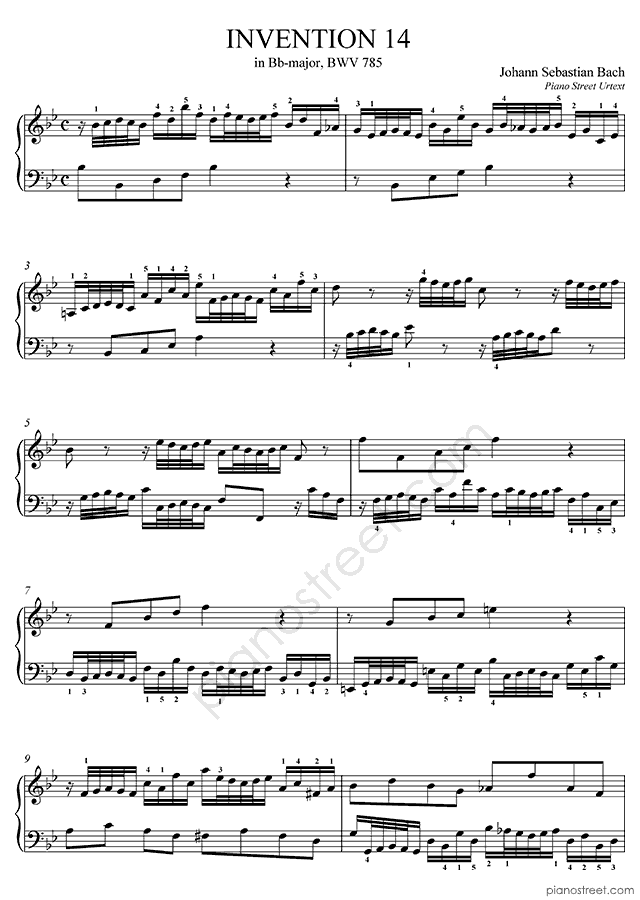 Downloadable piano sheet music from Inventions by Johann Sebastian Bach to print: Invention No. 14 in B-flat Major (published in 1723)