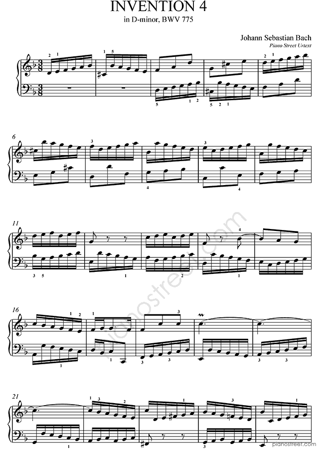 Johann Sebastian Bach, one of the prominent composers active in the Baroque era, has written this piece titled Invention No. 4 in D Minor from Inventions. The composition is categorized as "Polyphonic, Piece" in Piano Street's sheet music library and the level of difficulty is 5.