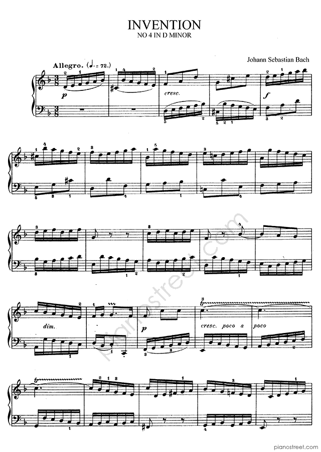 I've got to start somewhere, so why not start with the right piece! Where can I find Bach's Invention No. 4 to print? Preferrably a version that has the intendedly difficult fingering....