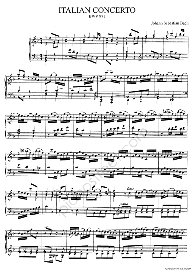 Johann Sebastian Bach, one of the prominent composers active in the Baroque era, has written this piece titled Italian Concerto BWV 971 in F Major . The composition is categorized as "Piece" in Piano Street's sheet music library and the level of difficulty is 8.