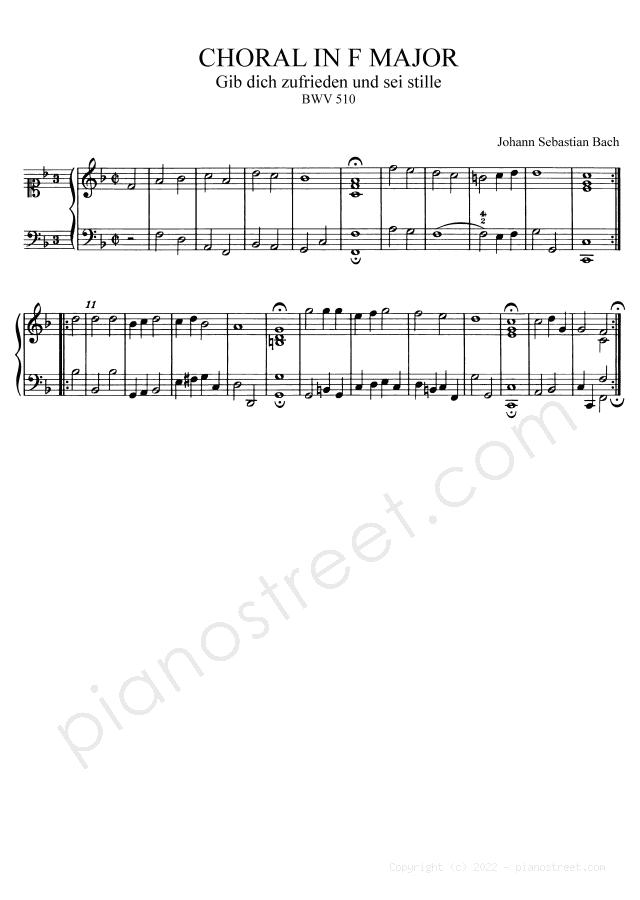 Chorale BWV 510 in F Major (published in 1725) from Notebook for Anna Magdalena Bach by Johann Sebastian Bach - piano sheet music to download and print instantly.