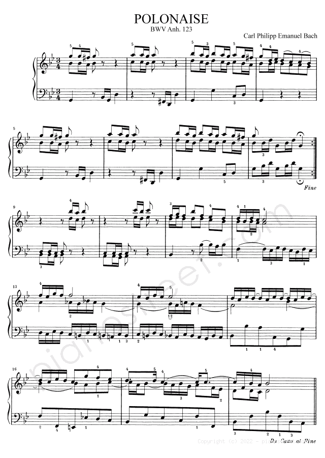 Downloadable piano sheet music from Notebook for Anna Magdalena Bach by Johann Sebastian Bach to print: Polonaise (by C. P. E. Bach) BWV Anh. 123 in G Minor (published in 1725)