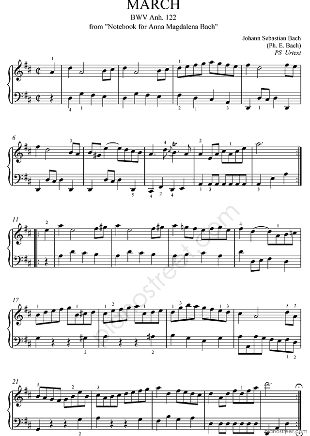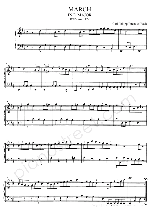 Downloadable piano sheet music from Notebook for Anna Magdalena Bach by Johann Sebastian Bach to print: March BWV 122 in D Major (published in 1725)