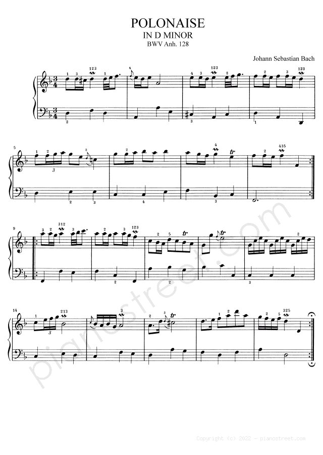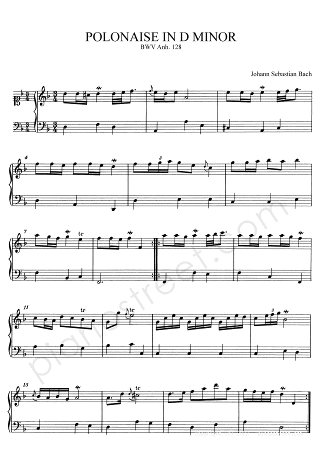 Polonaise BWV Anh. 128 in D Minor, by the baroque composer Johann Sebastian Bach. This piano piece was initially published in the year 1725 and is included in Notebook for Anna Magdalena Bach by Bach.