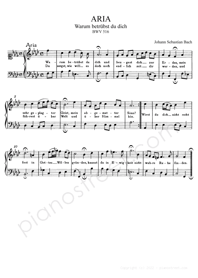 DOWNLOAD Aria: Warum betrübst du dich in F Minor BWV 516 by Johann Sebastian Bach (published in 1725) . High quality classical piano scores from the Piano Street sheet music library.