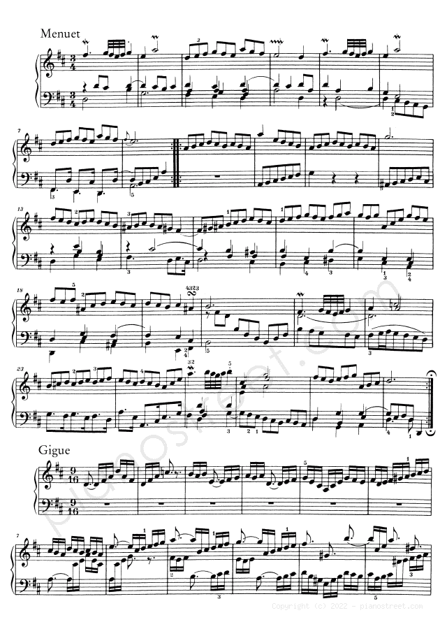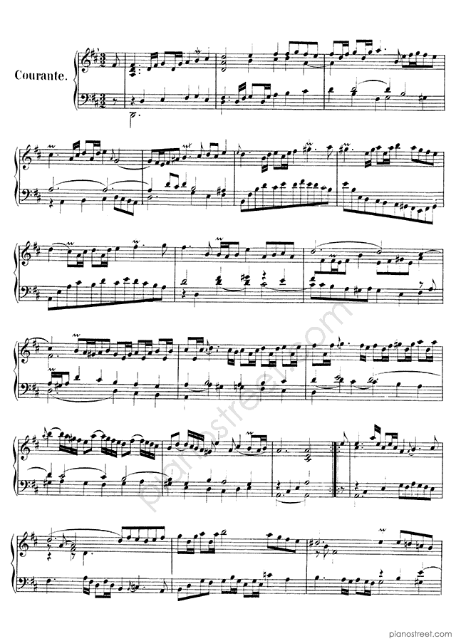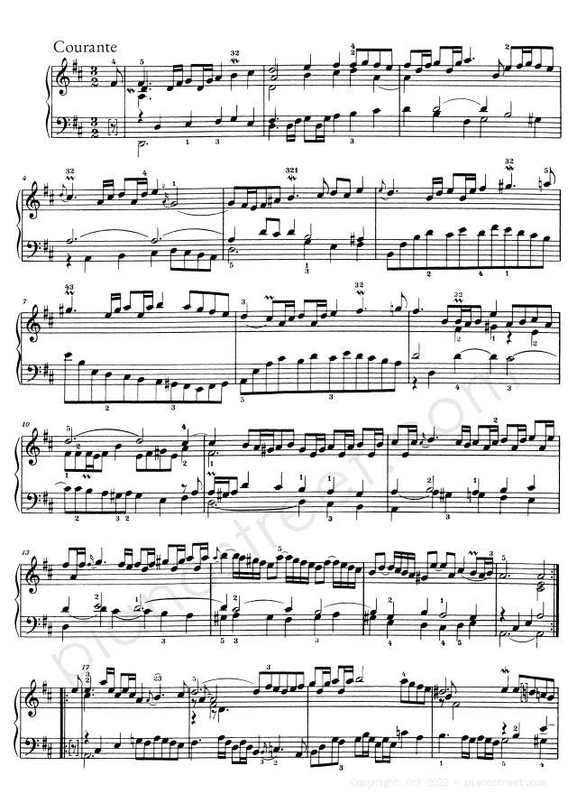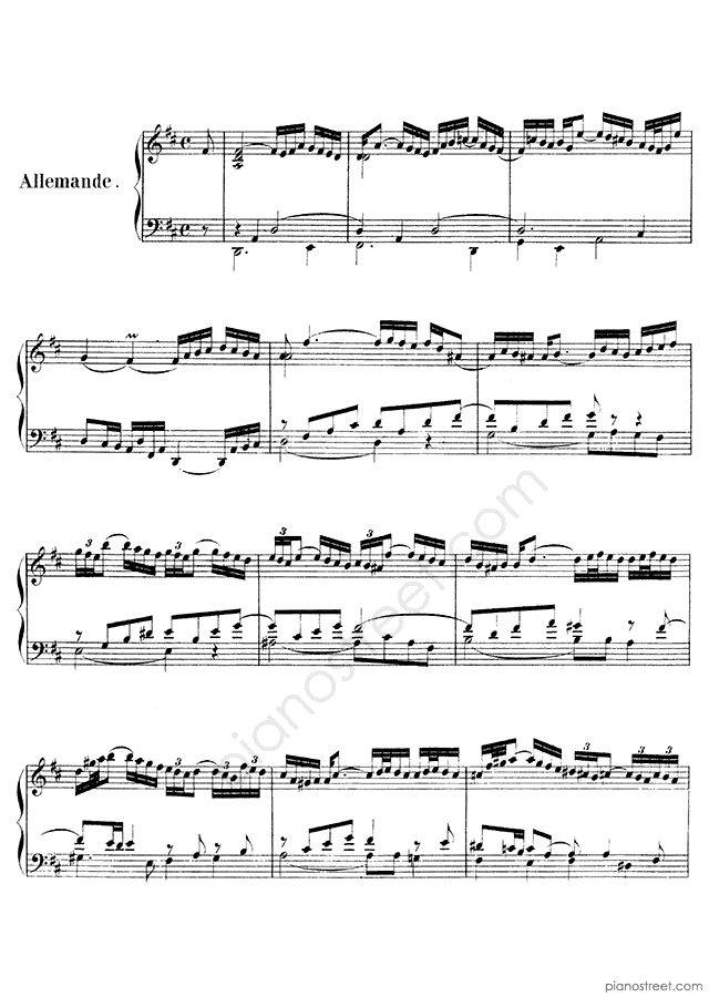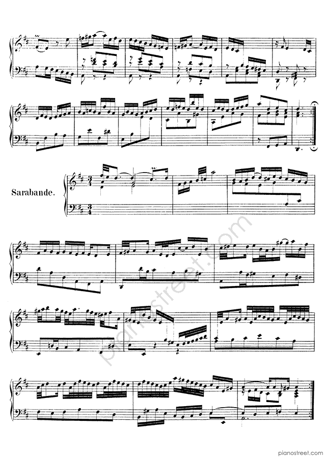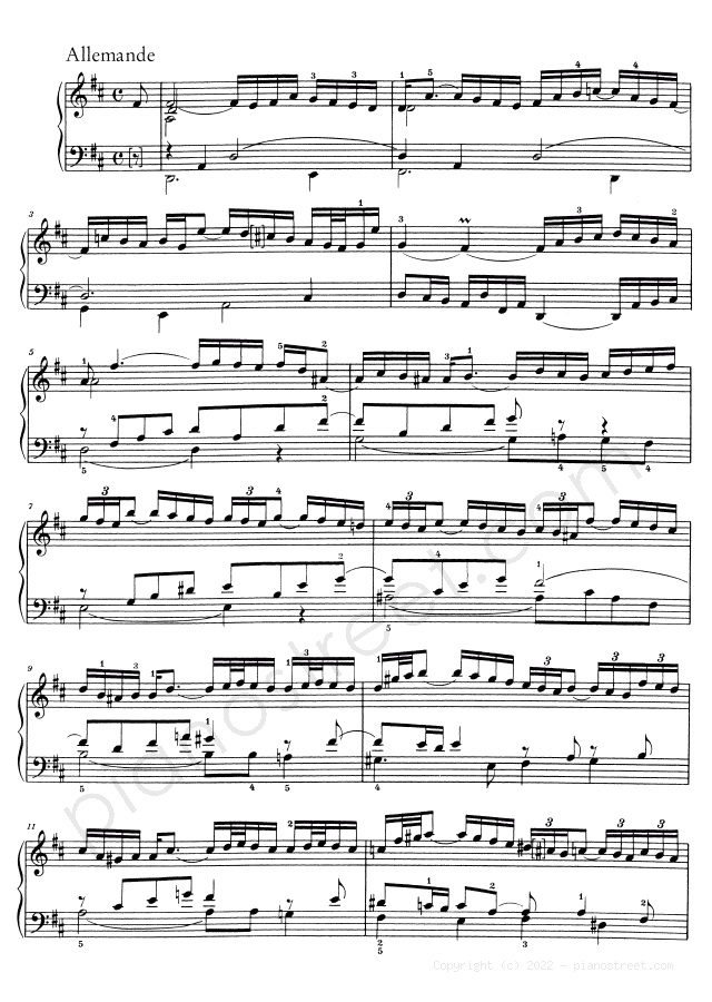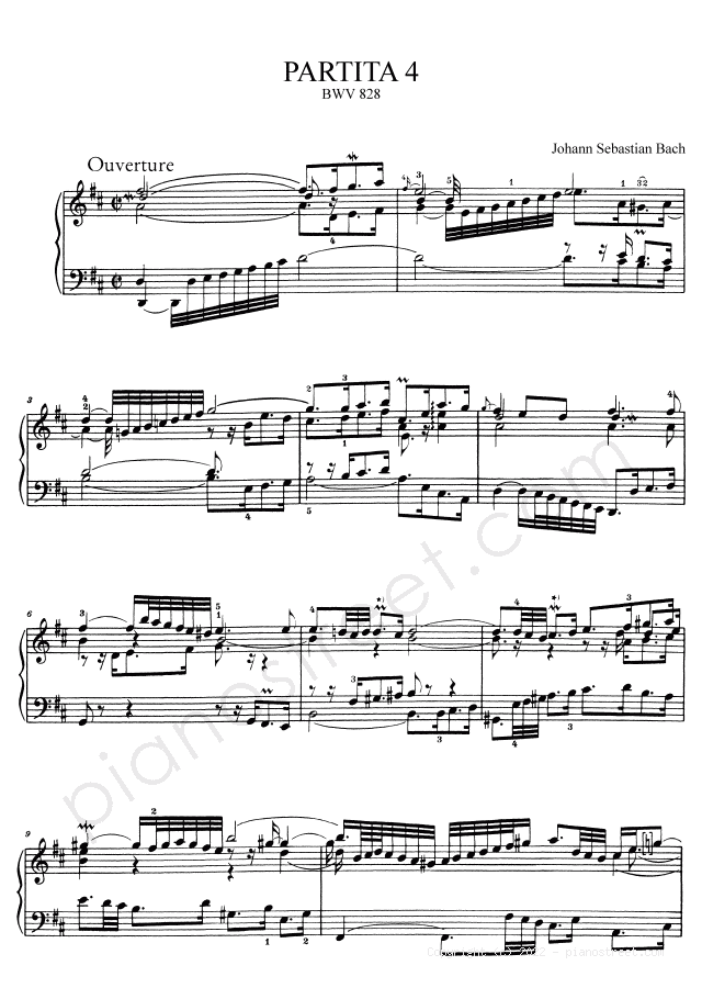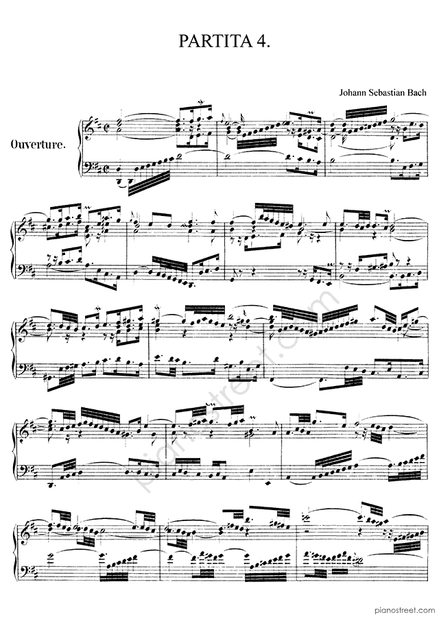 Baroque piano sheet music by Johann Sebastian Bach to download and print instantly: Partita No. 4 in the key of . Level 8+, compositional type: Polyphonic, Suite (published in 1731)