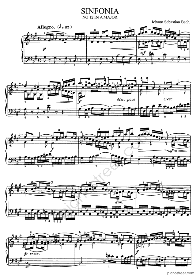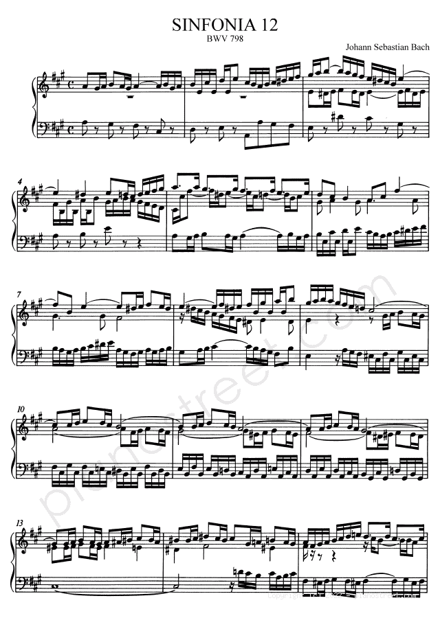 Baroque piano sheet music by Johann Sebastian Bach to download and print instantly: Sinfonia No. 12 in the key of . Level 7, compositional type: Polyphonic, Piece (published in 1723)