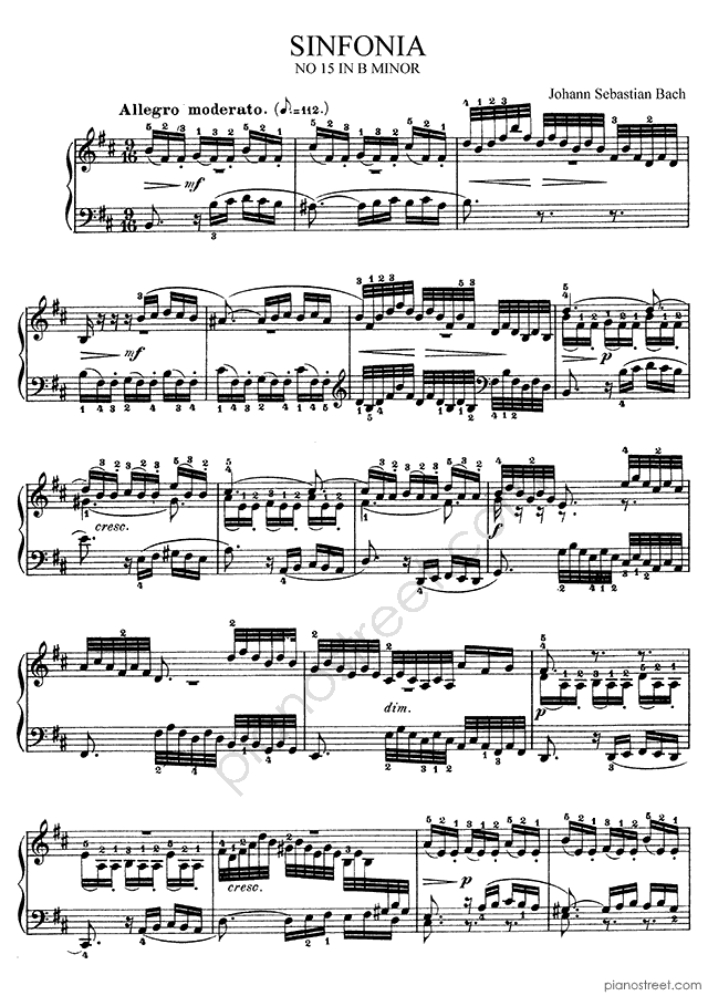 Bach: Sinfonia No. 15 in B Minor (published in 1723) . DOWNLOAD piano sheet music from Piano Street digital sheet music library.