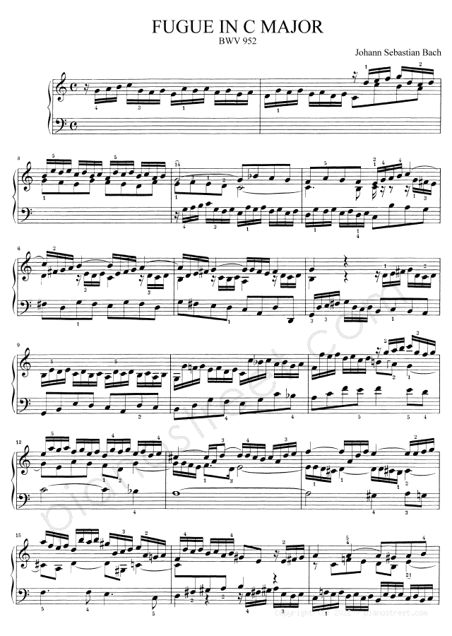 Fugue BWV 952 in C Major, by the baroque composer Johann Sebastian Bach. This piano piece was initially published in the year 1723 and is included in Small Preludes and Fughettas by Bach.