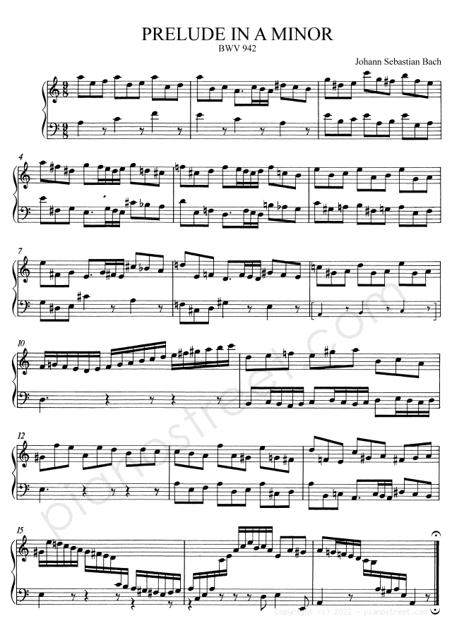 DOWNLOAD Small Prelude in A Minor BWV 942 by Johann Sebastian Bach (published in 1717) . High quality classical piano scores from the Piano Street sheet music library.