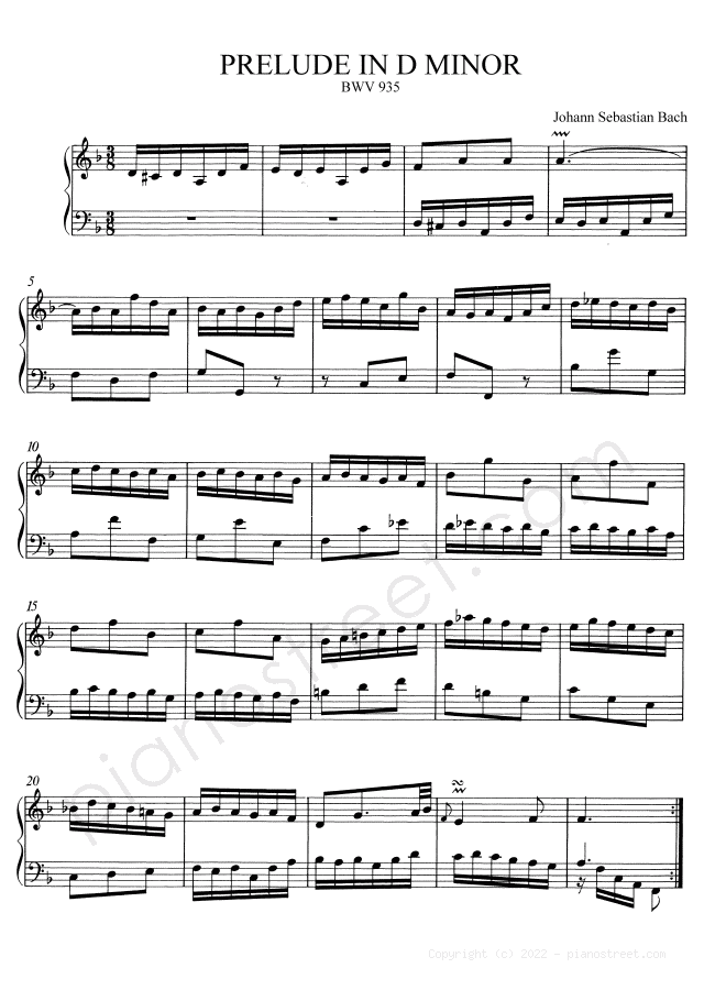 Small Prelude in D Minor, BWV 935 by the composer Johann Sebastian Bach who lived from 1685 to 1750.