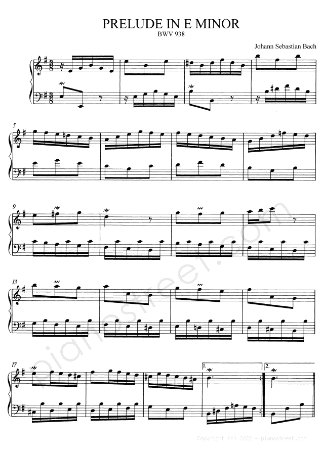 Bach: Small Prelude BWV 938 in E Minor (published in 1720) . DOWNLOAD piano sheet music from Piano Street digital sheet music library.