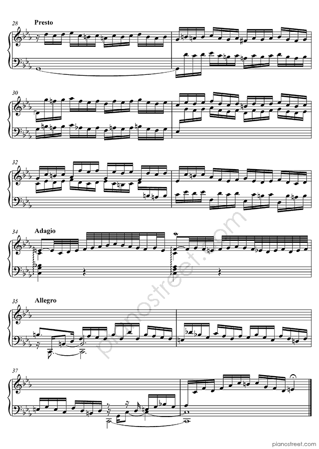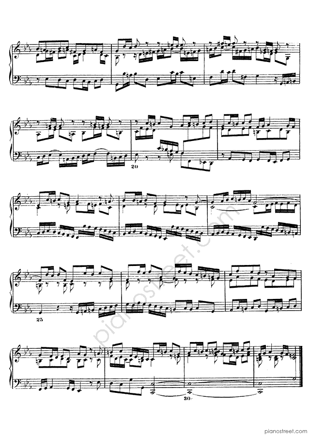 The catchy and dance-like Fugue is one of the easier fugues of the Well-Tempered Clavier. During its exposition, it introduces the subject and two countersubjects which remain faithful companions through subsequent subject entries. Its structure is clearly delineated, alternating these entries with episodes featuring sequences of material derived from the subject and countersubject throughout the piece. At the end comes a so-called “pedal point” – an octave-reinforced C held over multiple bars underlining the final entry of the subject, creating some delicious dissonances before the final resolution to a Picardy third.