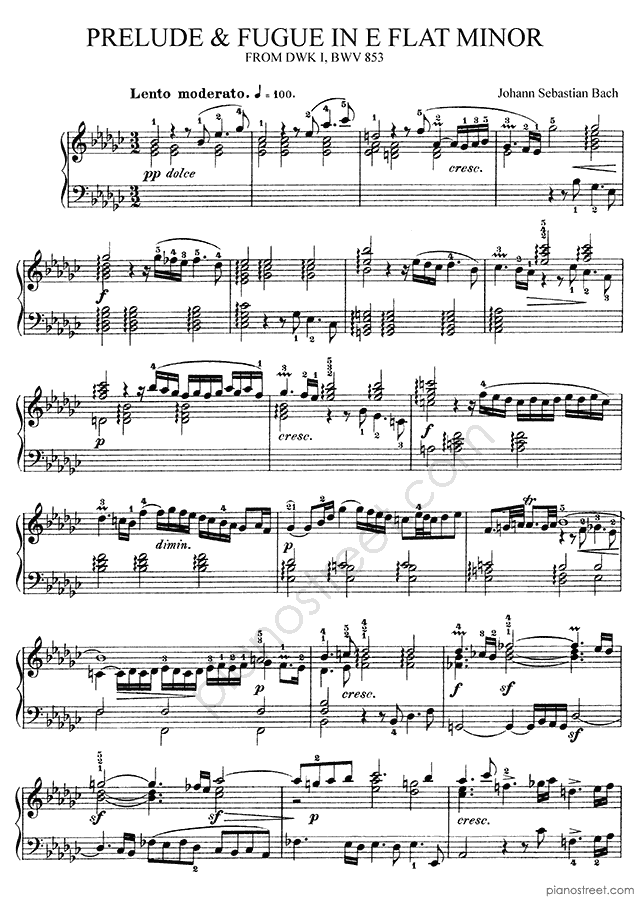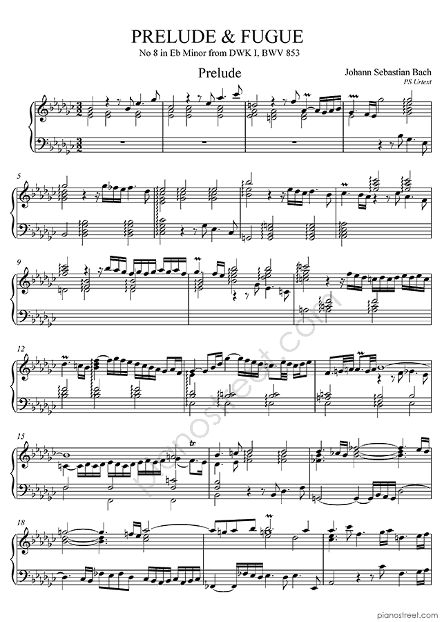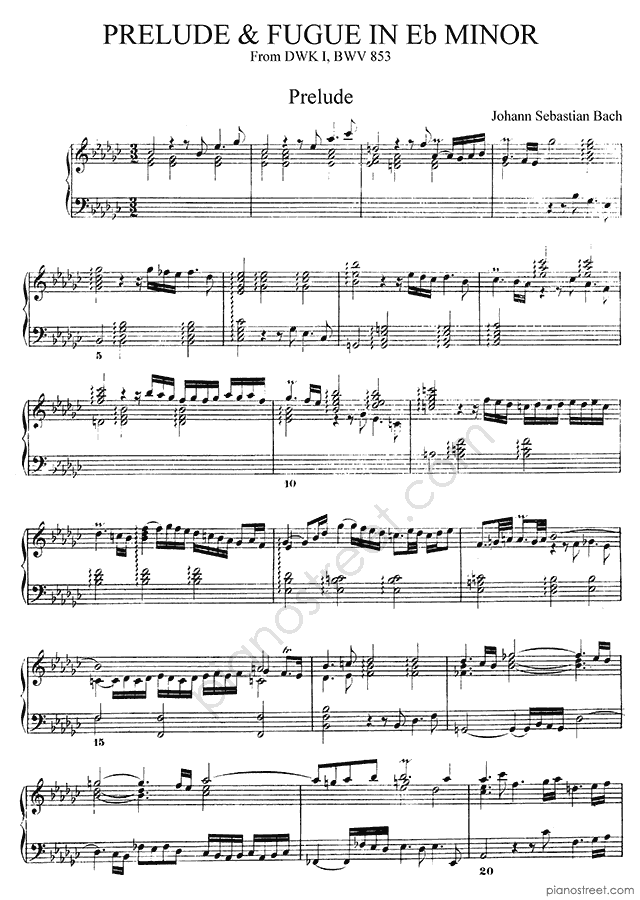 Prelude & Fugue in E-flat Minor BWV 853 No. 8 by Johann Sebastian Bach. Sheet music and recordings of thousands of piano pieces by Johann Sebastian Bach and many other famous composers to view in your digital device, print out or listen to.