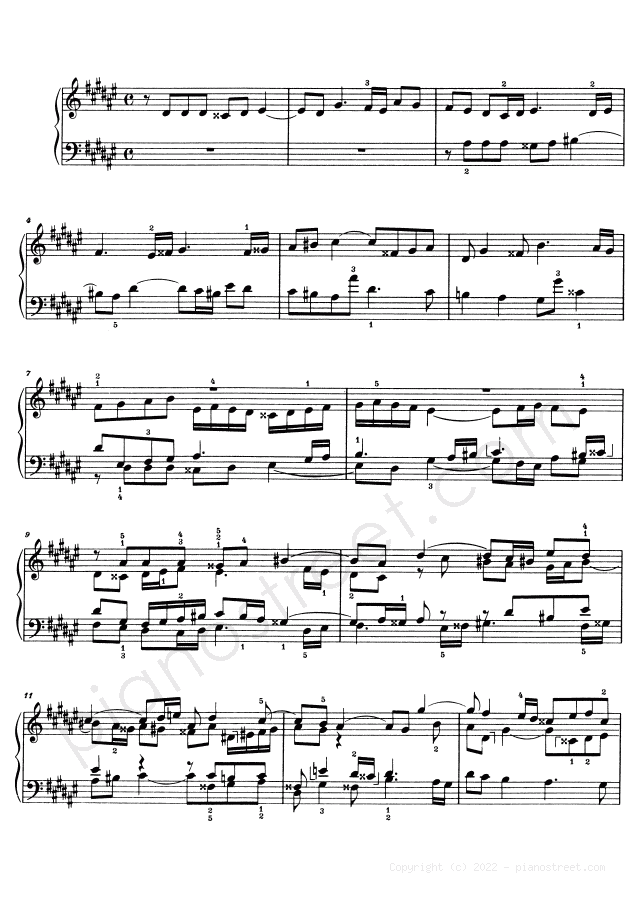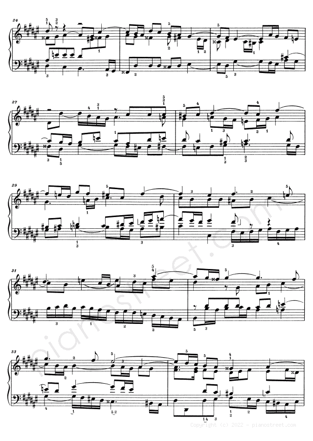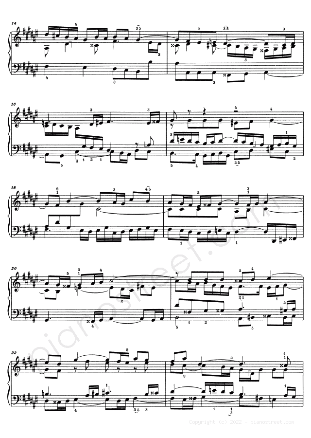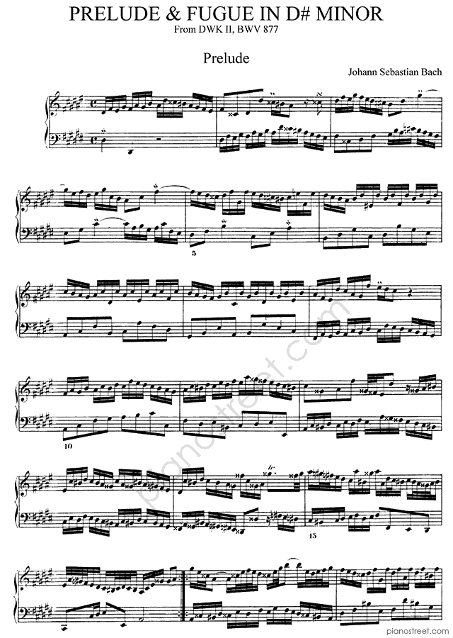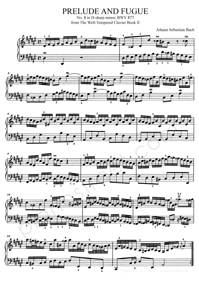Baroque piano sheet music by Johann Sebastian Bach to download and print instantly: Prelude & Fugue BWV 877 No. 8 in the key of . Level 8, compositional type: Polyphonic (published in 1738)