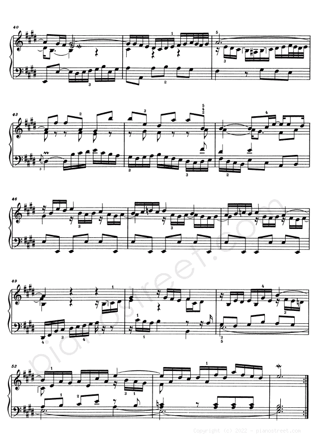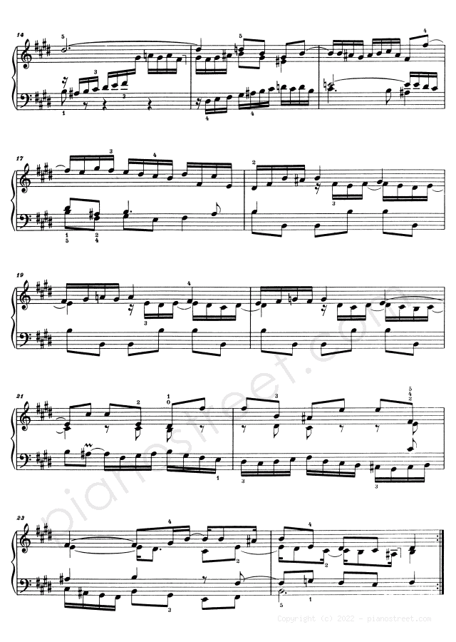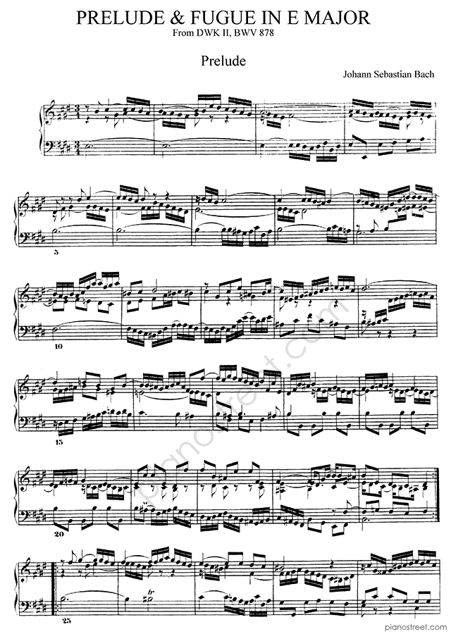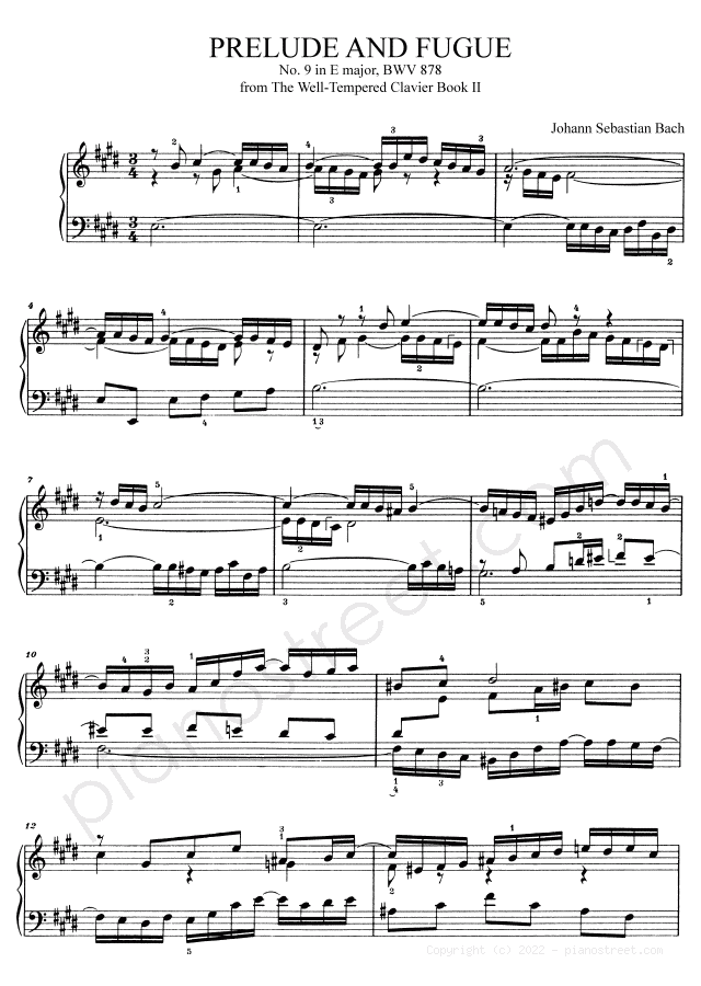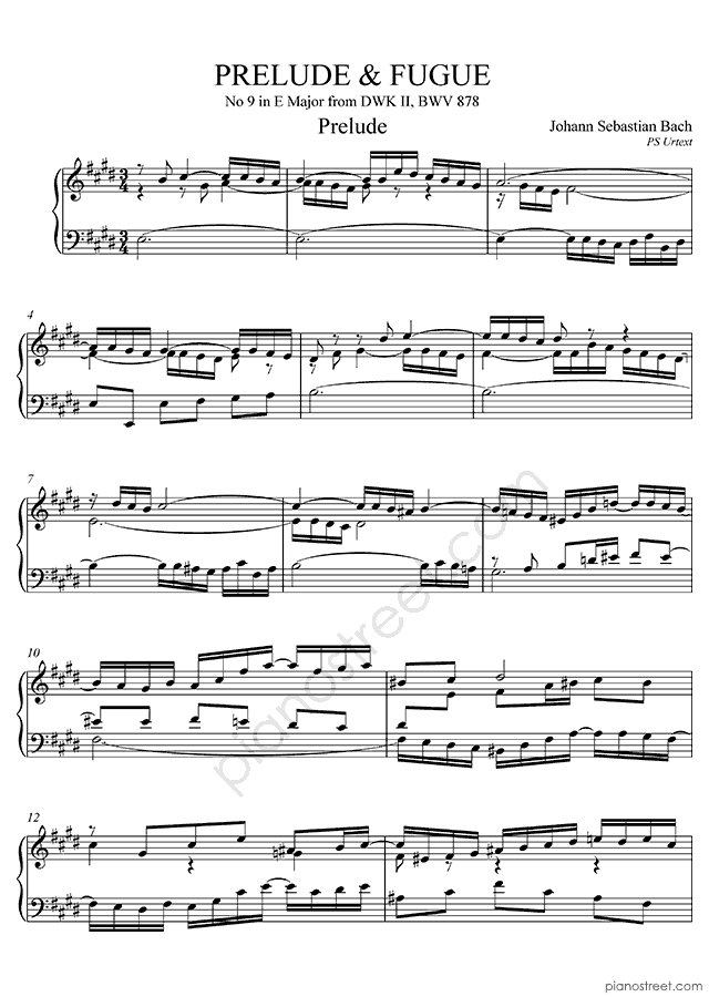 Piano sheet music and recordings. This piece is from WTC 2 by Johann Sebastian Bach: Prelude & Fugue BWV 878 No. 9 in E Major (published in 1738) . Level 8, Period: Baroque