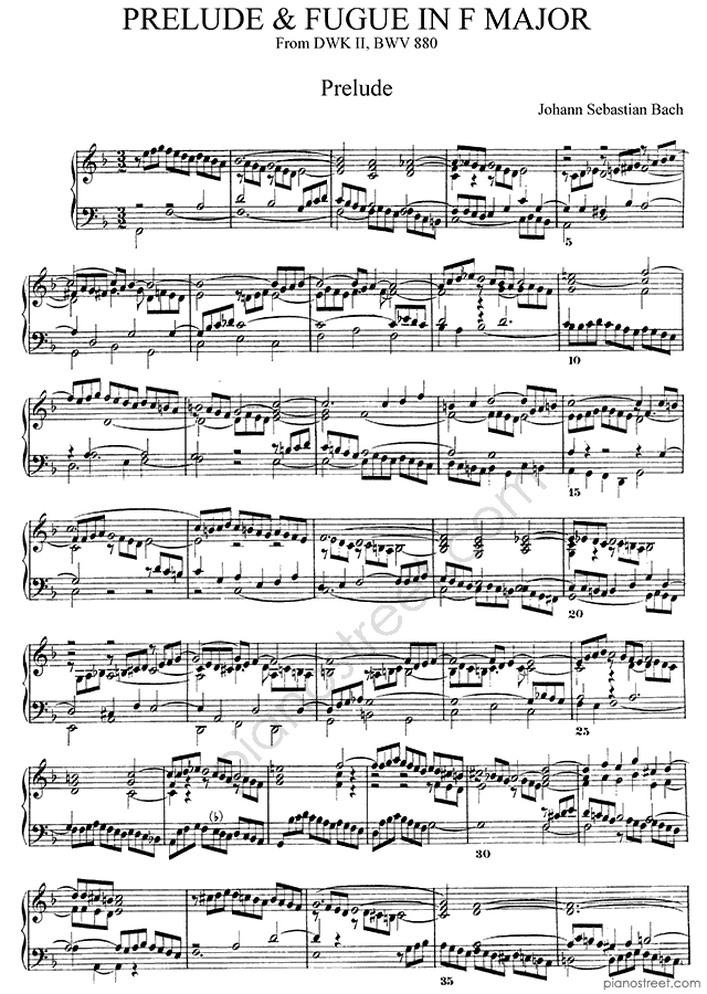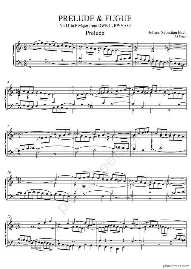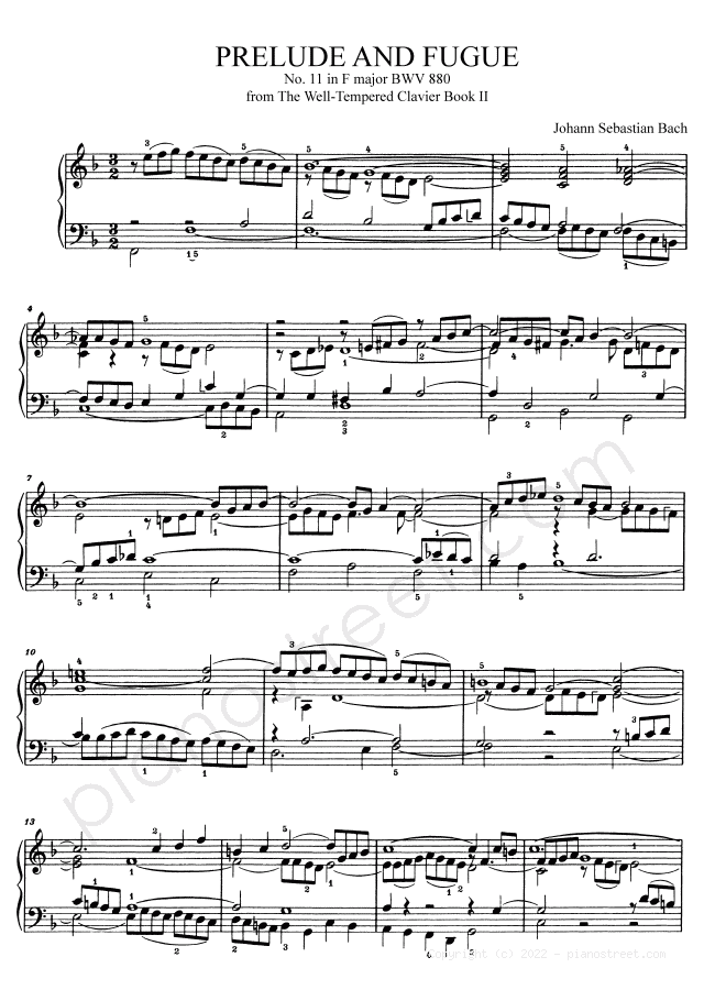 Bach: Prelude & Fugue BWV 880 No. 11 in F Major (published in 1738) . DOWNLOAD piano sheet music from Piano Street digital sheet music library.