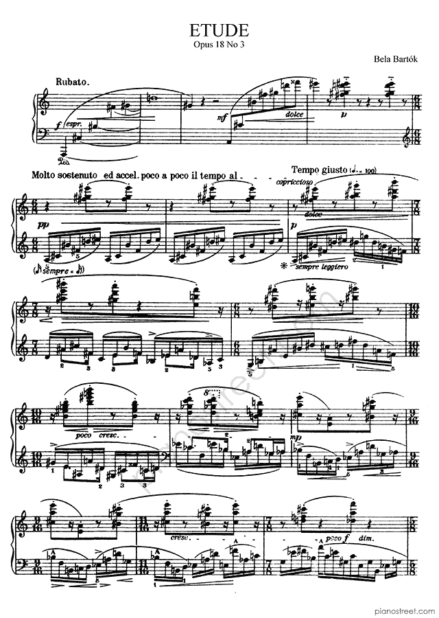 Etude Op. 18 No. 3 by Béla Bartók. Sheet music and recordings of thousands of piano pieces by Béla Bartók and many other famous composers to view in your digital device, print out or listen to.