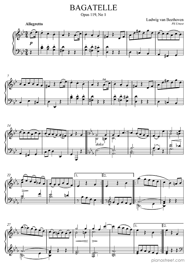 Piano sheet music downloads and recordings. This piece is from Bagatelles by Ludwig van Beethoven: Bagatelle Op. 119 No. 1 in G Minor (published in 1822) . Level 6, Period: Classical
