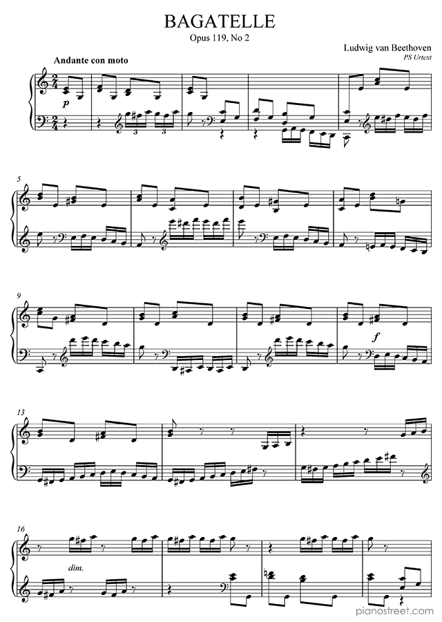 Ludwig van Beethoven: Bagatelle Op. 119 No. 2 in C Major from Bagatelles - piano sheet music to print instantly. This piece is level 7 and was composed during the Classical period.