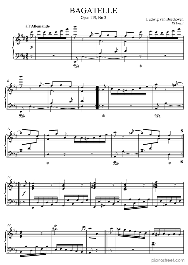 Beethoven: Bagatelle Op. 119 No. 3 in D Major (published in 1822) . DOWNLOAD piano sheet music from Piano Street digital sheet music library.