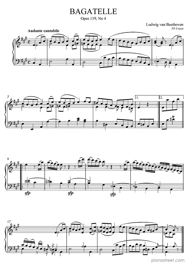 Bagatelle in A Major Op. 119 No. 4 by Ludwig van Beethoven. Sheet music and recordings of thousands of piano pieces by Ludwig van Beethoven and many other composers to view in digital devices, print or listen to.