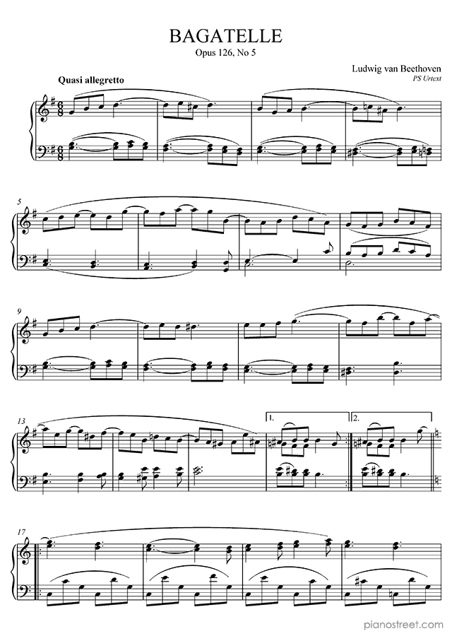 Bagatelle Op. 126 No. 5 in G Major, a composition by the classical composer Ludwig van Beethoven who was born in 1770 and died in 1827. The piano score of this piece was first published in 1824 and is part of Beethoven's Bagatelles.