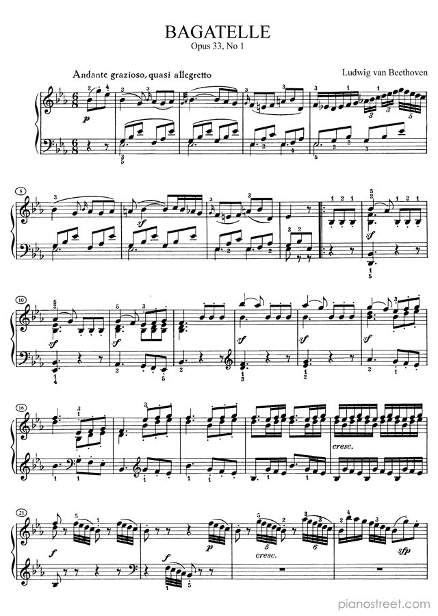 Bagatelle in E-flat Major Op. 33 No. 1 by Ludwig van Beethoven. Sheet music and recordings of thousands of piano pieces by Ludwig van Beethoven and many other famous composers to view in your digital device, print out or listen to.