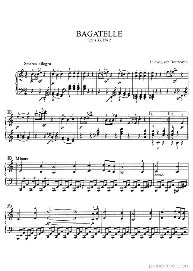 Bagatelle in C Major - Op. 33 No. 2 is a piano piece by the classical composer Ludwig van Beethoven who lived between the years 1770 and 1827.