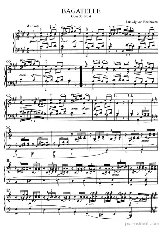 DOWNLOAD Bagatelle in A Major Op. 33 No. 4 by Ludwig van Beethoven (published in 1803) . High quality classical piano scores from the Piano Street sheet music library.