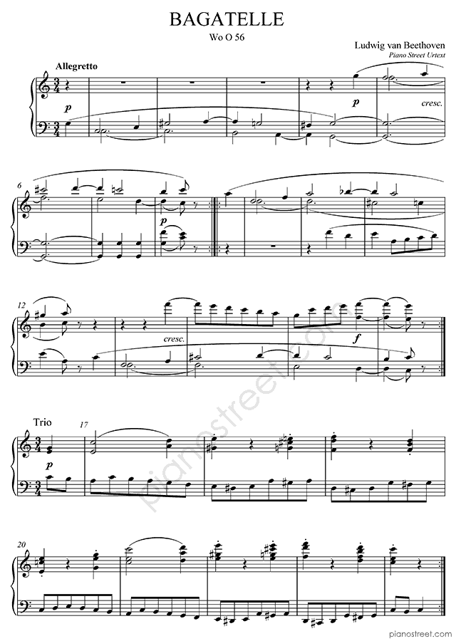 Piano sheet music downloads and recordings. This piece is from Bagatelles by Ludwig van Beethoven: Bagatelle, WoO 56 in C Major (published in 1804) . Level 4, Period: Classical