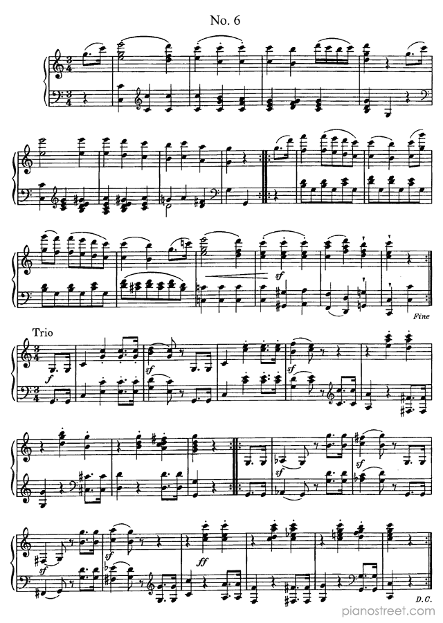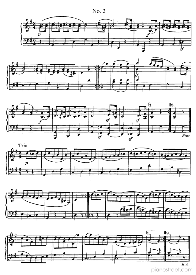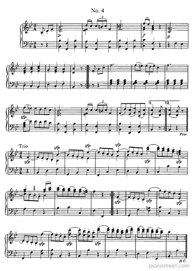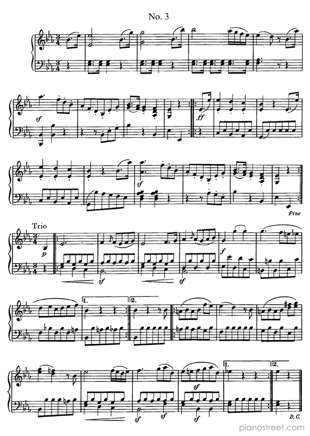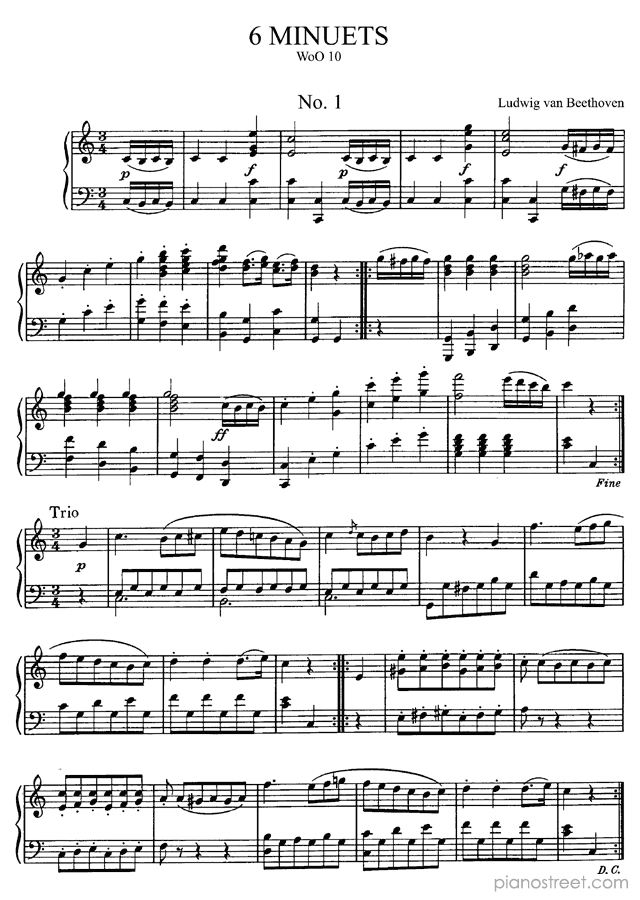 Classical piano sheet music by Ludwig van Beethoven to download and print instantly: 6 minuets WoO 10 in the key of . Level 4, compositional type: Suite (published in 1795)