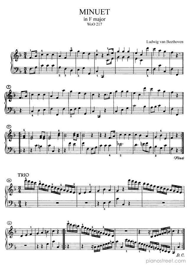 Piano sheet music and recordings. This piece is from Dances by Ludwig van Beethoven: Minuet WoO 217 in F Major . Level 3, Period: Classical