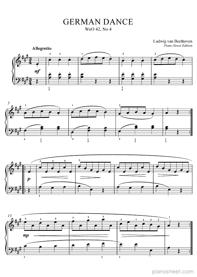 German Dance in A Major No. 4 WoO 42 by Ludwig van Beethoven. Sheet music and recordings of thousands of piano pieces by Ludwig van Beethoven and many other composers to view in digital devices, print or listen to.