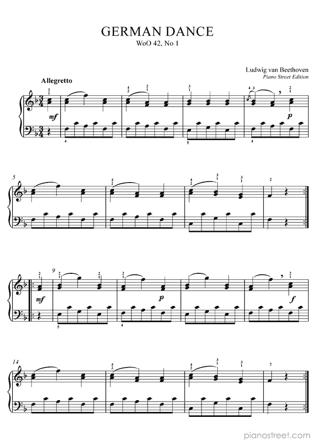 DOWNLOAD German Dance in F Major No. 1 WoO 42 by Ludwig van Beethoven (published in 1795) . High quality classical piano scores from the Piano Street sheet music library.